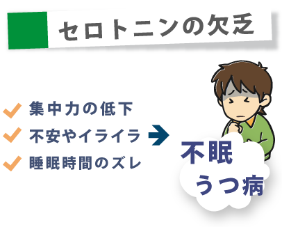 - セロトニンが不足する(セロトニンとは安心感をもたらす神経伝達物質で、セロトニンが不足することで脳内の神経ネットワークに不都合が生じているのが原因)