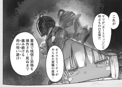 - ミーティ:アビスの上昇負荷問題を解決するための実験で”成れ果て”にされ、ミーティが獲得した不死性の検証のためにたびたび身体を損傷させられる